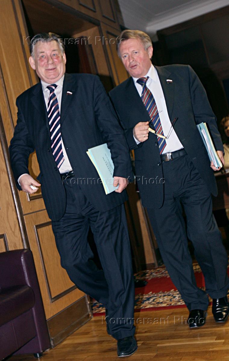 Chairman of the Russian State Duma Committee for Mandatory and Ethics Issues Gennady Raykov, left, attends a session of the State Duma Council devoted to measures against bird flue.