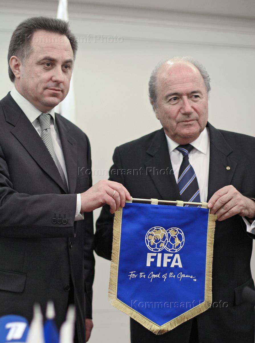FIFA president Joseph Sepp Blatter, right, and President of the Russian Football Union Vitaly Mutko, left, attend a press conference in Olympiysky sports complex.