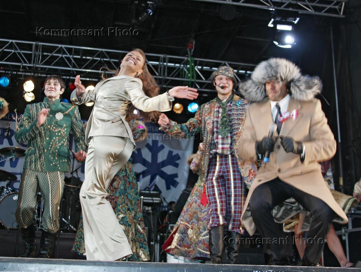 Rhythmic Gymnastics Olympic Champion Alina Kabayeva, left, and TV anchor Andrey Malakhov, right, celebrate old New Year at Trafalgar Square.