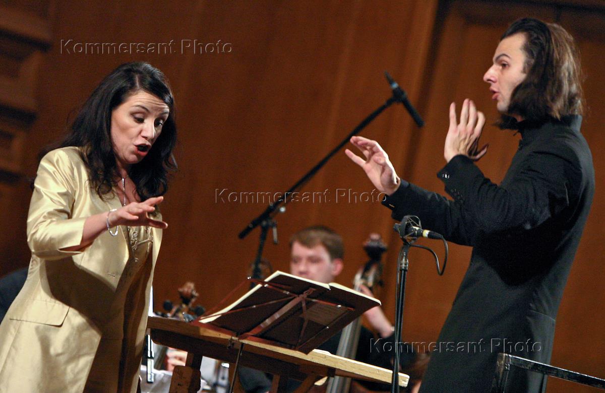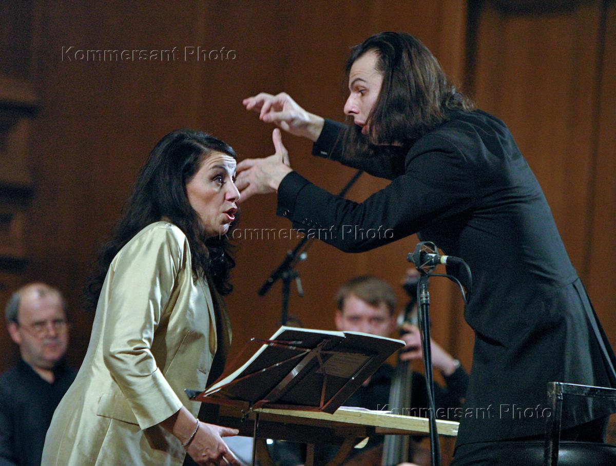 Дирижер Теодор Курентзис (справа) и итальянская оперная певица Анна Бонитатибус (слева) во время исполнения концертной версии оперы "Орфей и Эвридика" в Большом зале консерватории (БЗК).