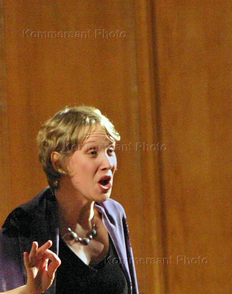 Opera singer from Great Britain Deborah Jork during execution of the concert version of an opera "Orfej and Evridika" in the Big hall of conservatory.