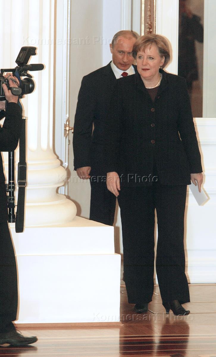 Russian President Vladimir Putin, left, met German Chancellor Angela Merkel, right, in Kremlin.