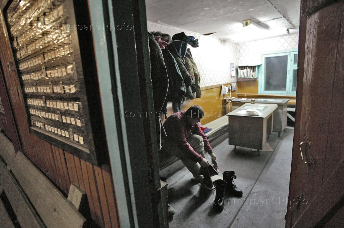 Золотодобывающий рудник Бадран в Якутии. Рабочий в раздевалке перед сменой.