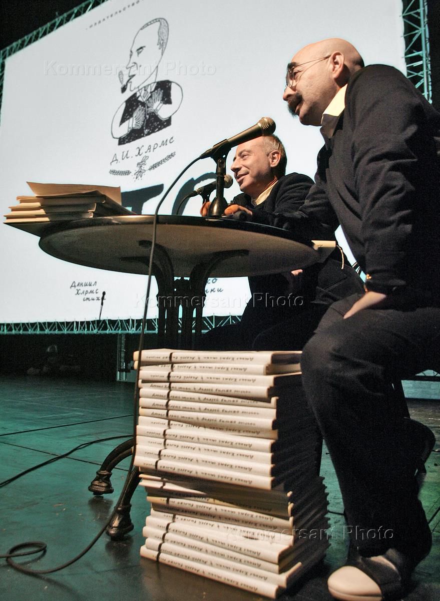 Cartoon artist Andrey Bilzho, right, takes part in an event devoted to the 100th birthday of poet Daniil Kharms. The concert took place in the Meyerhold Centre.