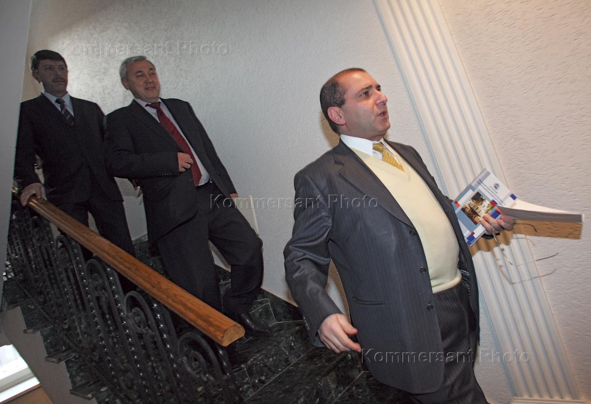 Президент Ассоциации российских банков (АРБ) Гарегин Тосунян (справа) перед началом пресс-конференции, посвященной предложениям и замечаниям АРБ по проектам поправок в законы "О банках и банковской деятельности" и "О противодействии легализации (отмыванию) доходов, полученных преступным путем", а также работе банковского сообщества над программой "Национальная банковская система России - 2010, 2020". Пресс-конференция прошла в здании Ассоциации российских банков.
