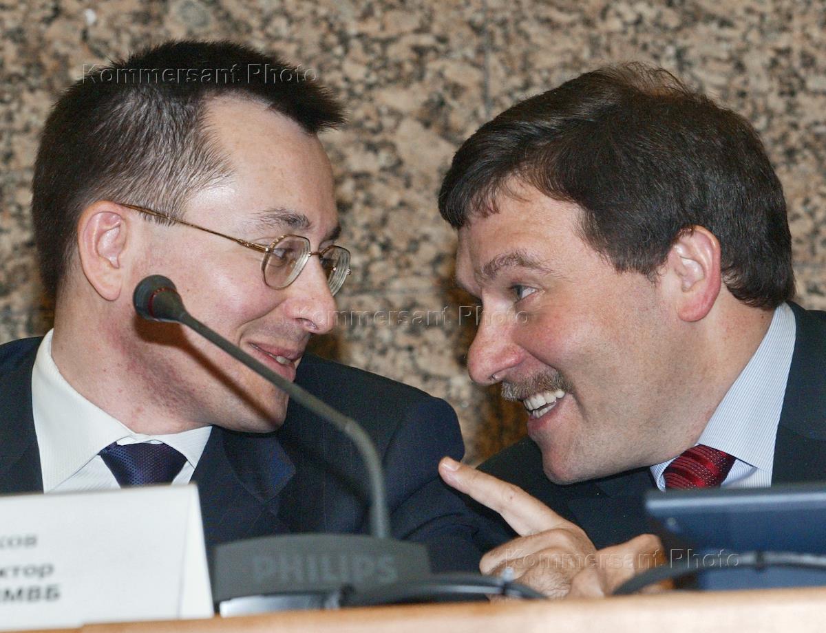 Генеральный директор ЗАО "Фондовая биржа ММВБ" Алексей Рыбников (слева) и президент ЗАО "Московская Межбанковская Валютная биржа" (ММВБ) Александр Потемкин (справа) во время заседания "Круглого стола" в здании ММВБ.