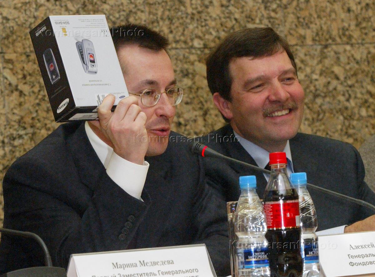 Первый заместитель генерального директора ЗАО "Фондовая биржа ММВБ" Марина Медведева (слева), генеральный директор ЗАО "Фондовая биржа ММВБ" Алексей Рыбников (в центре) и президент ЗАО "Московская Межбанковская Валютная биржа" (ММВБ) Александр Потемкин (справа) во время заседания "Круглого стола" в здании ММВБ.