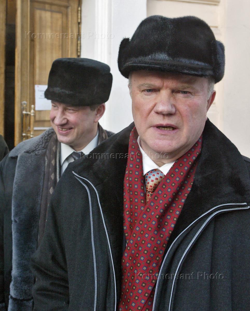 Лидер Коммунистической партии России (КПРФ) Геннадий Зюганов (справа) после окончания пресс-конференции на тему: "Планы коммунистов на 2006 год". Пресс-конференция прошла в центральном офисе агентства "Интерфакс".
