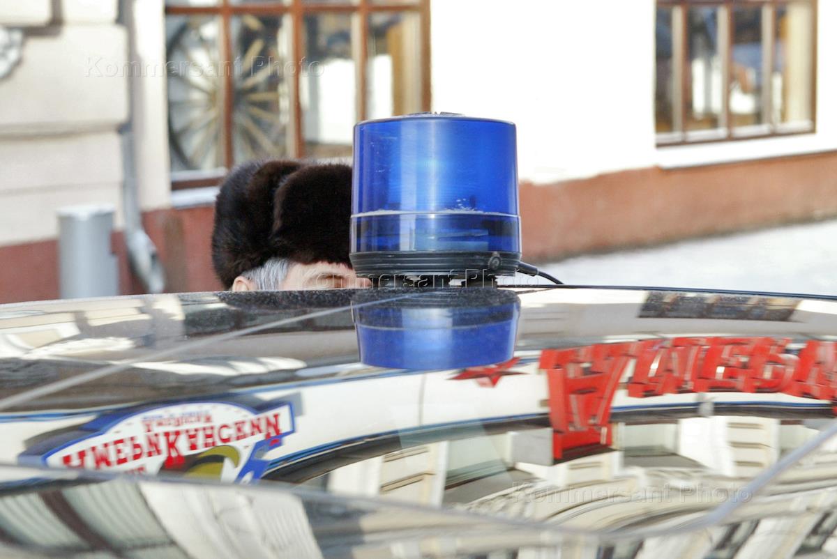 Автомобиль со спецсигналом на крыше у входа в здание центрального офиса агентства "Интерфакс".