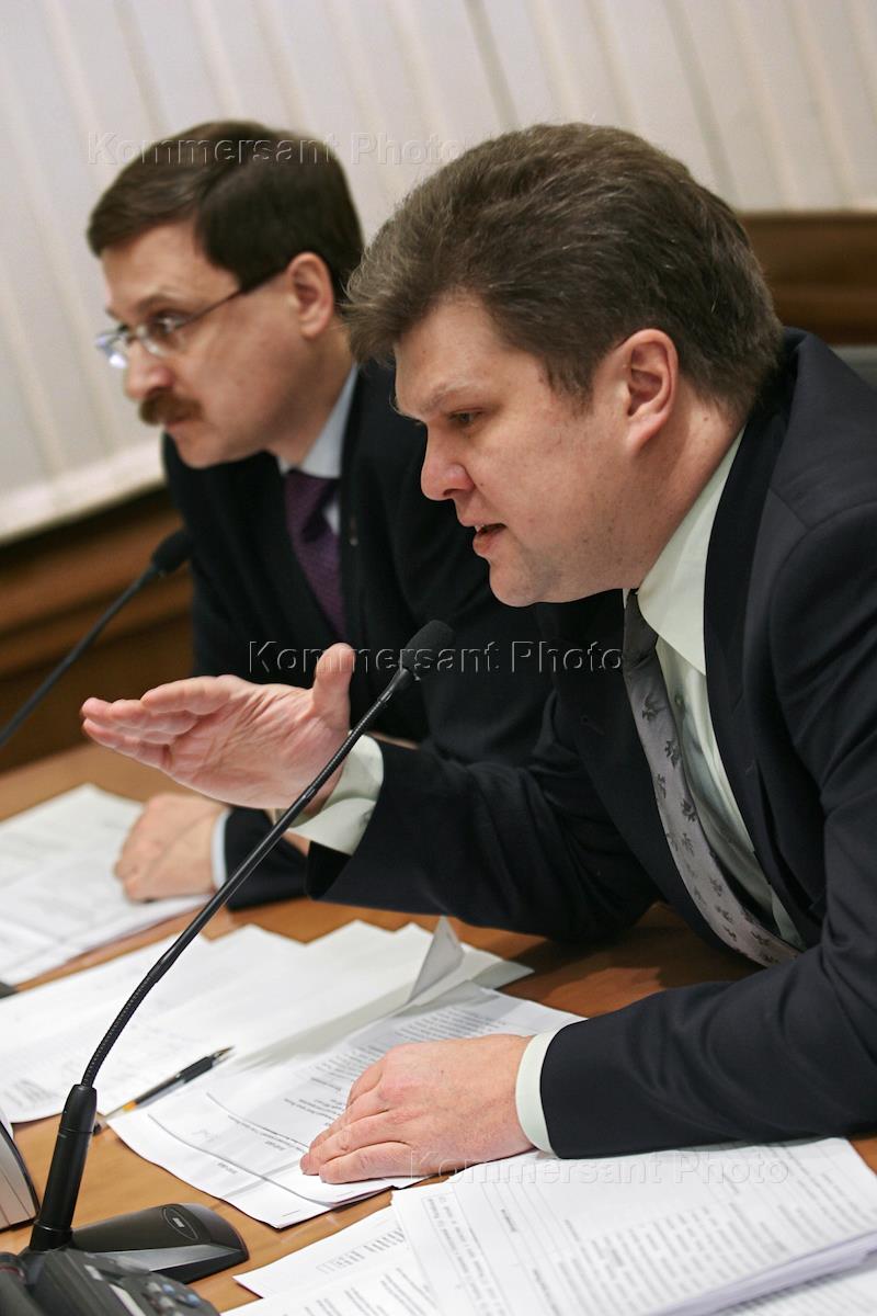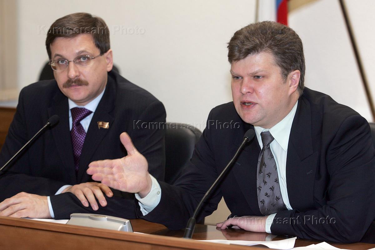 Заместитель председателя Российской демократической партии (РДП) "Яблоко" Сергей Митрохин (справа) во время депутатских слушаний на тему: "Права москвичей на участие в принятии решений, касающихся их микрорайона, муниципального образования". Слушания прошли в Московской городской думе.