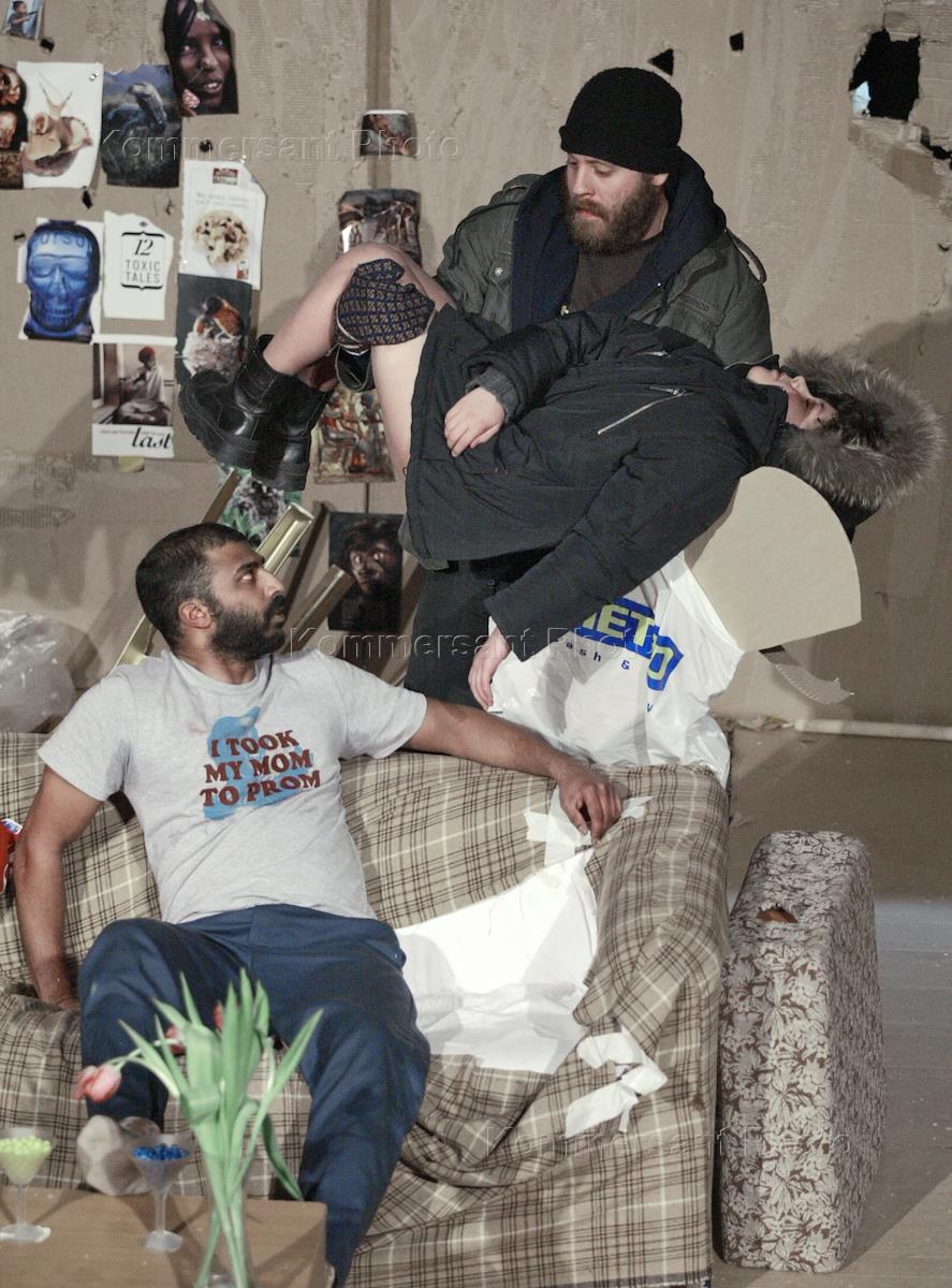 Actors of the 6th Studio of the Chekhov Moscow Art Theatre (MKHT) perform during the play "Finer Noble Gases" by american playwright Adam Rapp staged in "Na Strastnom" Theatre.