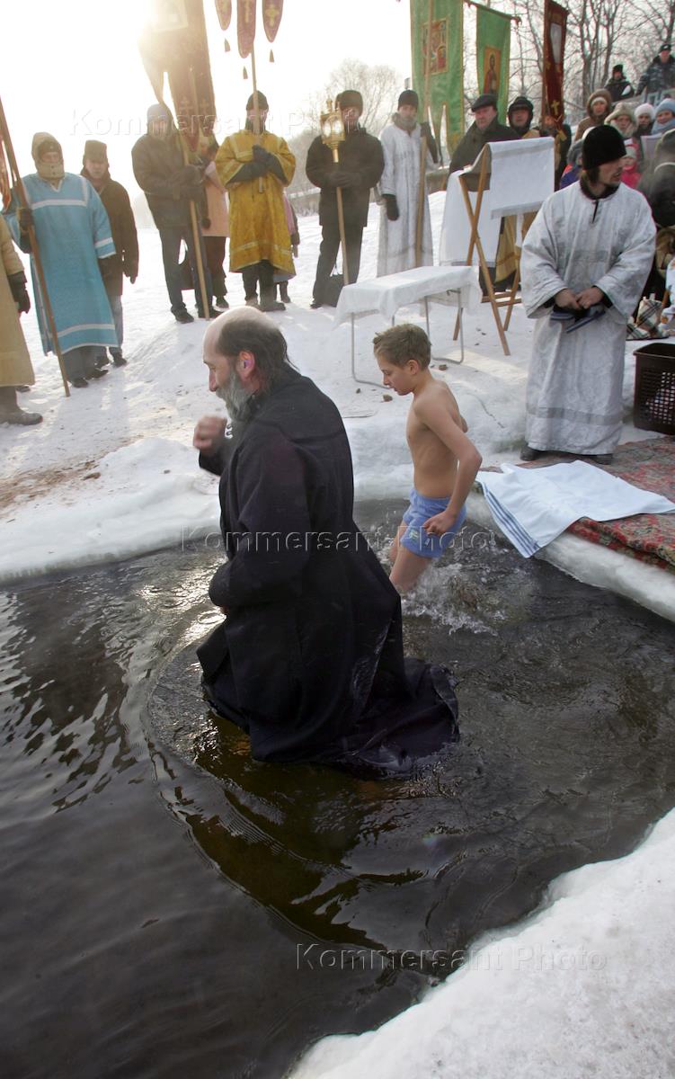 Russian people plunge into an ice-hole during celebrations of Epiphany. Traditional 'Epiphany bathing' symbolises batism of Christ and ice-holes in rivers are blessed by the priests to represent holy waters of the Jordan River.