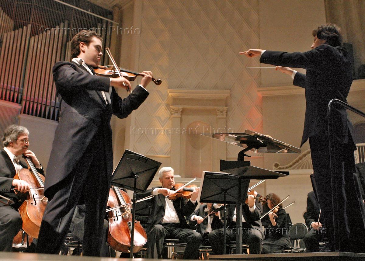 Conductor Yarvy Kristian and violinist Mikhail Simonyan, left, perform during a concert with the Russian National Orchestra in the Tchaikovsky Concert Hall.