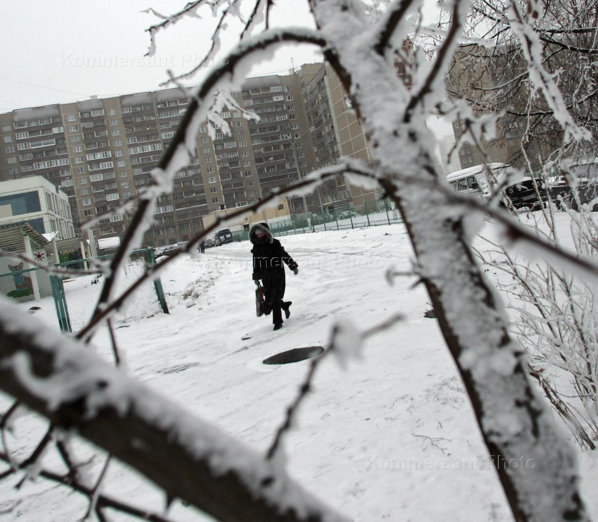 Морозы в Москве. Заиндевевшие ветви деревьев и закутавшиеся прохожие.