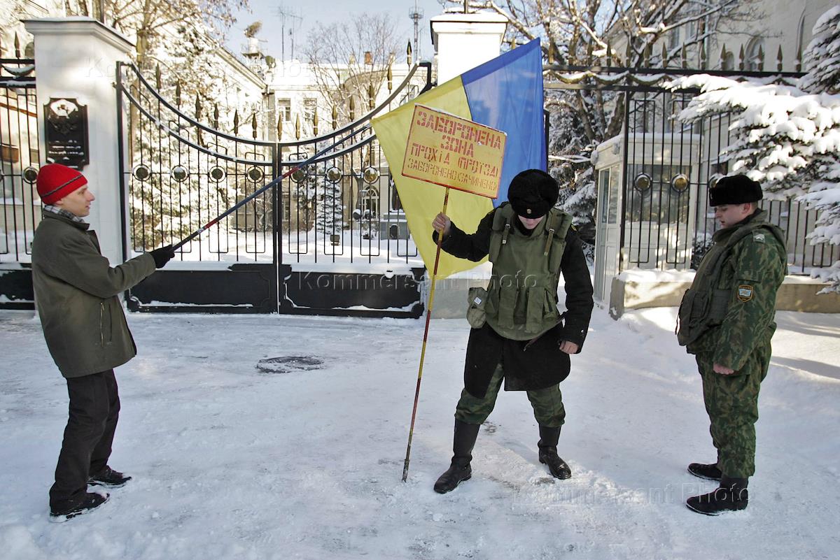 Пикет возле штаба Черноморского флота. Плакат "Мы за дружбу между Украиной и Россией!".