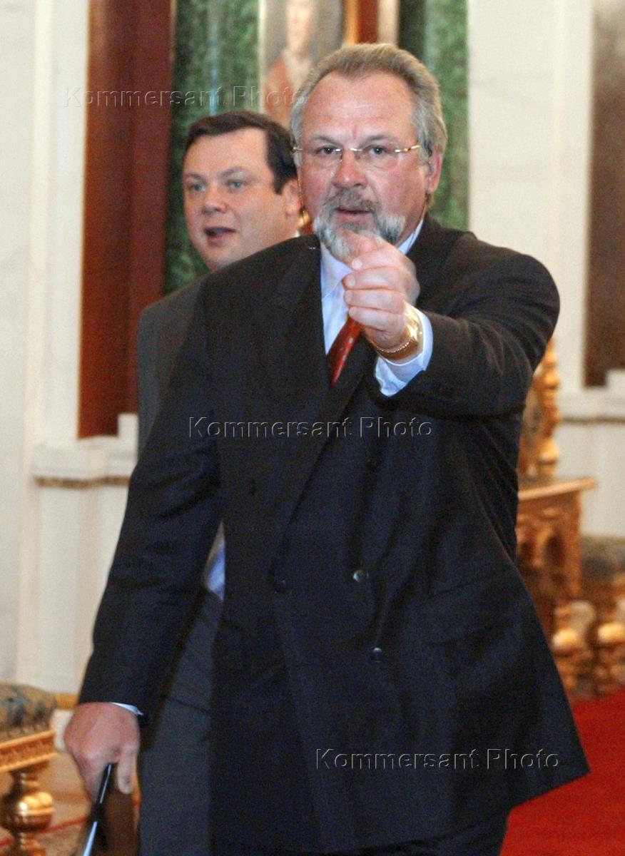 Председатель Совета директоров "Альфа-Групп" Михаил Фридман (слева) и главный редактор газеты "Московский комсомолец" Павел Гусев (справа) на первом пленарном заседании Общественной палаты в Георгиевском зале Кремля.
