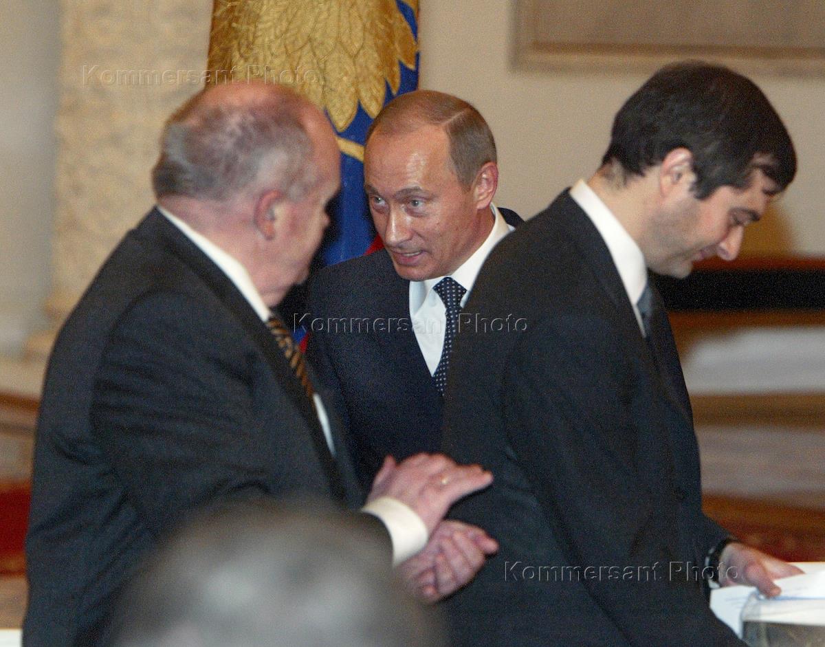 Президент России Владимир Путин (в центре), директор Института атомной энергии им. И.В.Курчатова, академик Евгений Велихов (слева) и заместитель руководителя администрации Президента России Владислав Сурков (справа) на первом пленарном заседании Общественной палаты в Георгиевском зале Кремля.