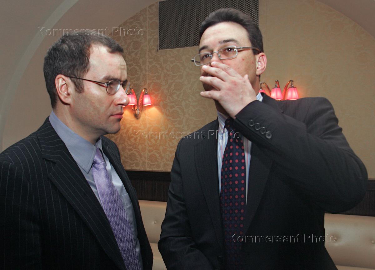 Tver Region Governor Dmitry Zelenin, left, and President of the Mobile TeleSystems Vasily Sidorov, right, attend a party of the Managers Associations, held in the Theatre restaurant.