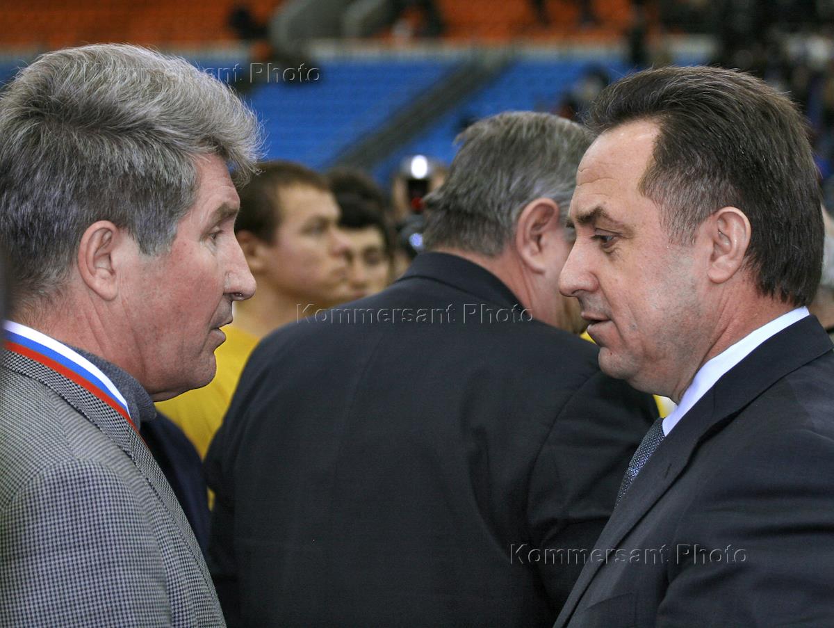 The 14th Commonwealth Cup final match between Lithuania's FC Kaunas and Baku's FC Neftchi was played in Olimpiysky sport complex with the score of 2-4. Kunas's chief coach Eduard Malofeyev, left, and President of the Russian Football Union (RFS) Vitaly Mutko, right, attend the awards ceremony.