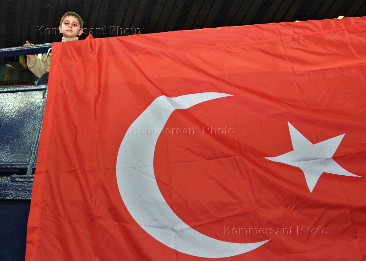 A bypasser waves to football fans leaving the Olympiysky sport complex after the 14th Commonwealth Cup final match between Lithuania's FC Kaunas and Baku's FC Neftchi.
