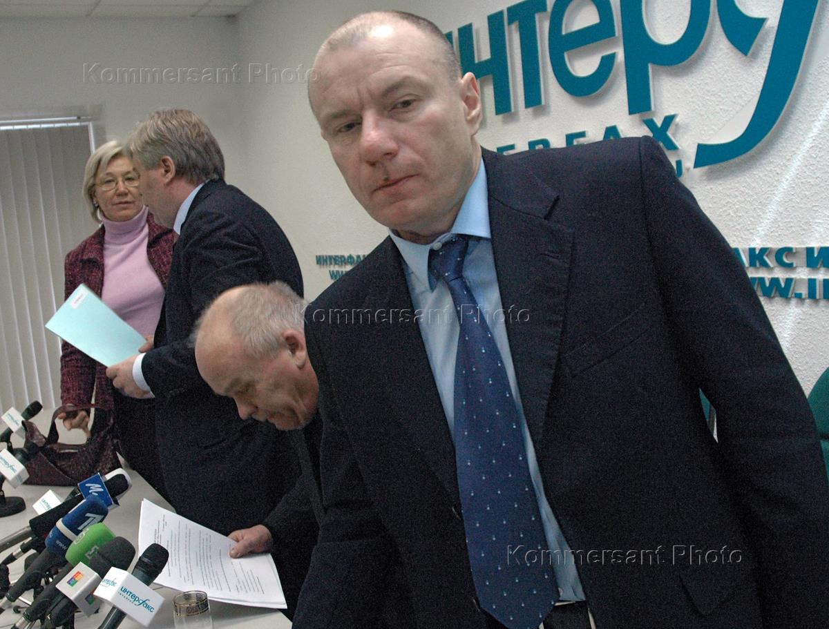 Interros company president Vladimir Potanin, right, takes part in the press conference of the Public Chamber members. The conference took place in Interfax news agency.