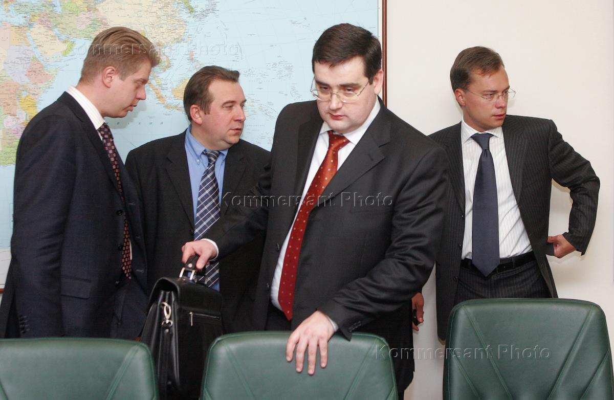 Руководитель проекта "SsangYong" в "Северсталь-авто" Сергей Павленко (слева), директор по стратегическому развитию ОАО "Северсталь-авто" Алексей Рахманов (второй слева) и директор по маркетингу "Северсталь-Авто" Василий Бойцов (второй справа) на пресс-конференции, посвященной реализации проекта сотрудничества ОАО "Северсталь-авто" с "Fiat Auto" и развитию дистрибуции автомобилей "Fiat" в России.