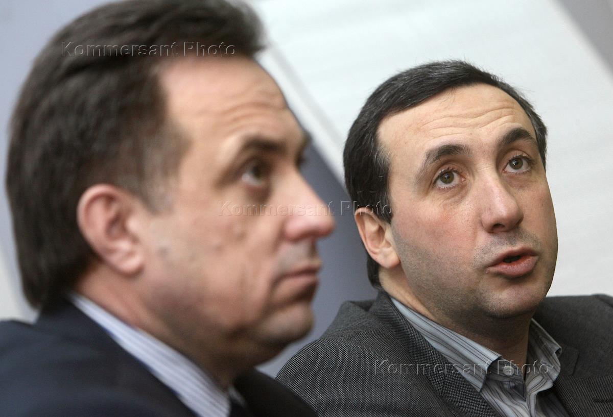 President of the Russian Football Union (RFS) Vitaly Mutko, left, takes part in elections of the Russian Football Premier League (RFPL) president. President of FC CSKA Yevgeny Giner, right, was reelected as RFPL president.