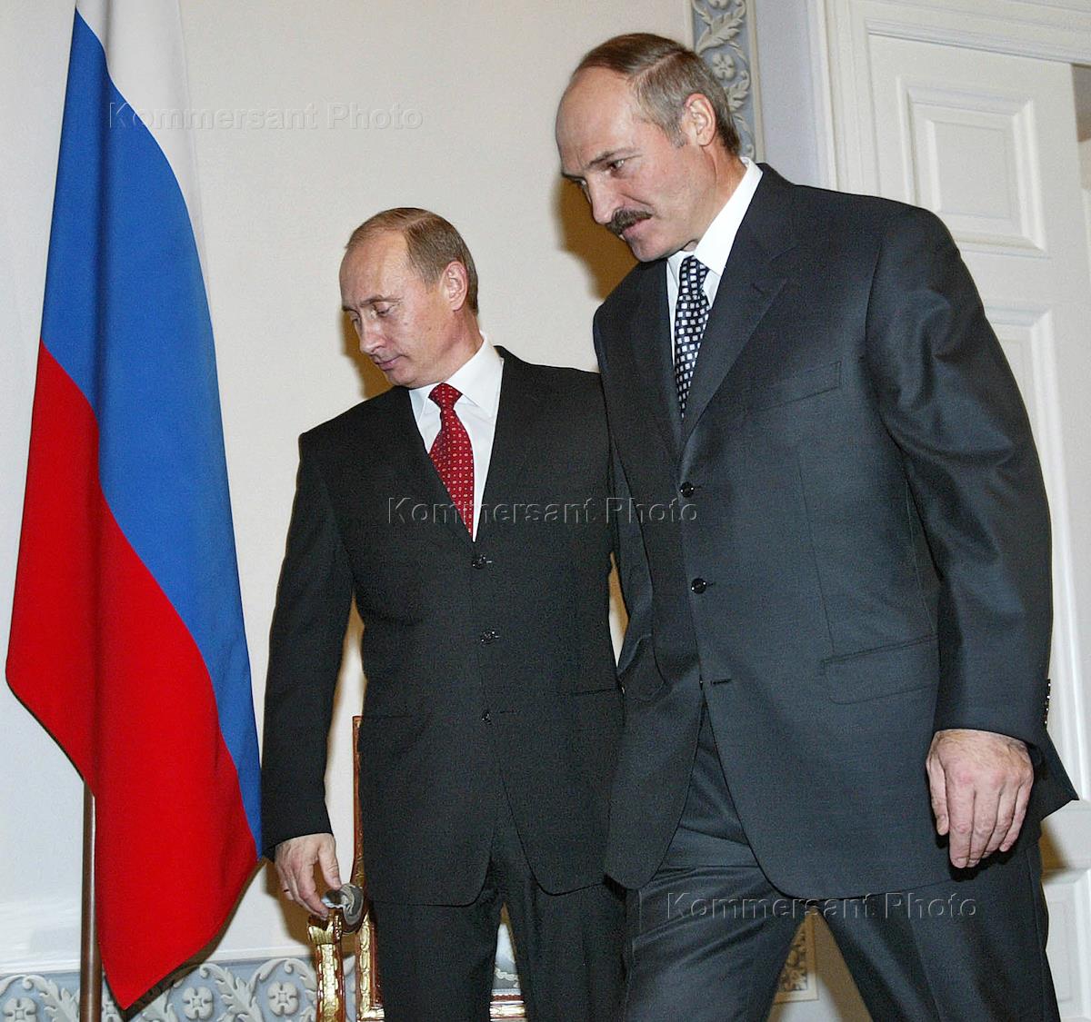 Президент России Владимир Путин (справа) и президент Белоруссии Александр Лукашенко (слева) во время встречи в Константиновском дворце под Петербургом перед началом заседания Высшего Государственного совета России и Белоруссии.