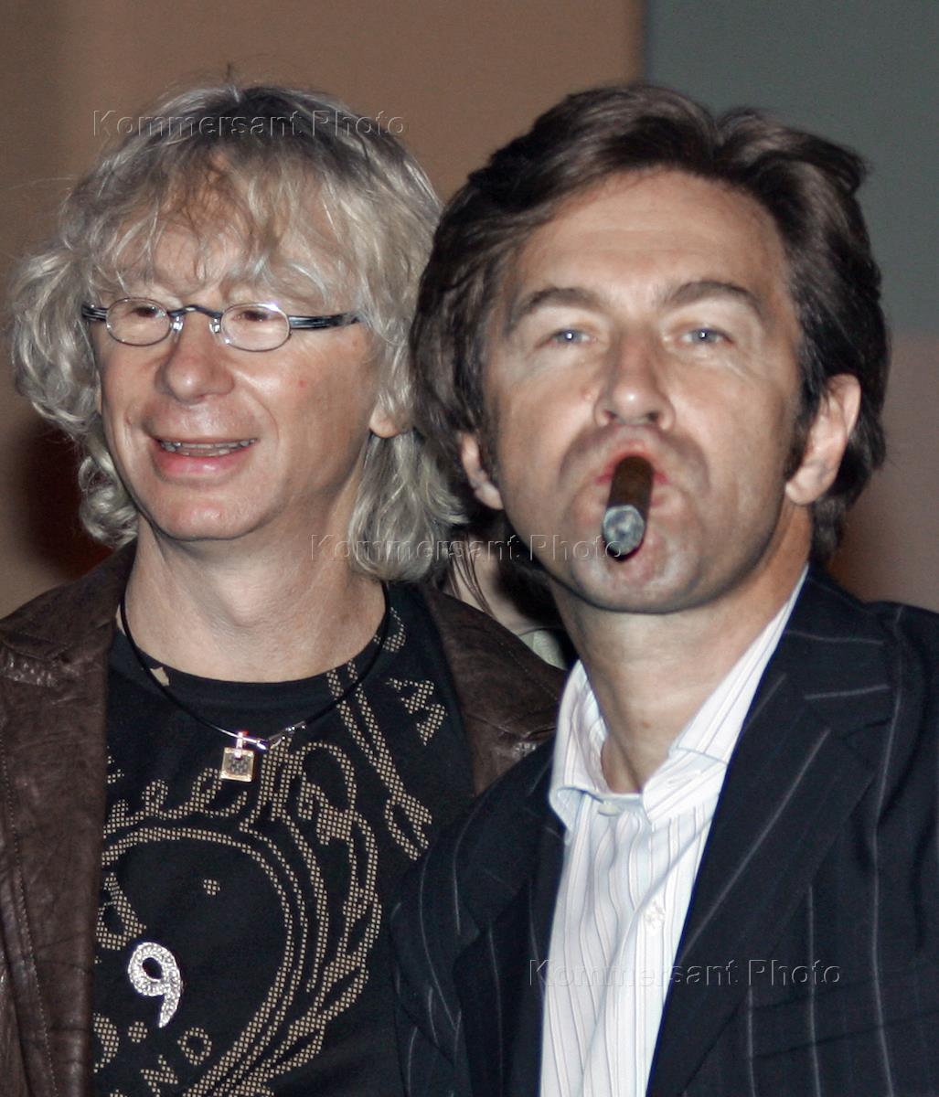 Композитор и певец Аркадий Укупник (слева) и певец Валерий Сюткин (справа) на праздновании дня рождения художника – постановщика студии "Краснов дизайн" Бориса Краснова в "Форум-Холле".