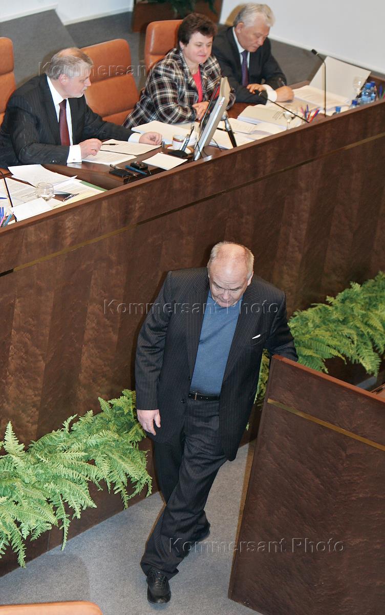 Chairman of the Federation Council (SF) Sergey Mironov, left, his Deputies Svetlana Orlova, centre, and Mikhail Nikolayev, right, and Director of the Nuclear Power Institute of I.V.Kurchatov Evgeny Velikhov, down, attend a Federation Council session.
