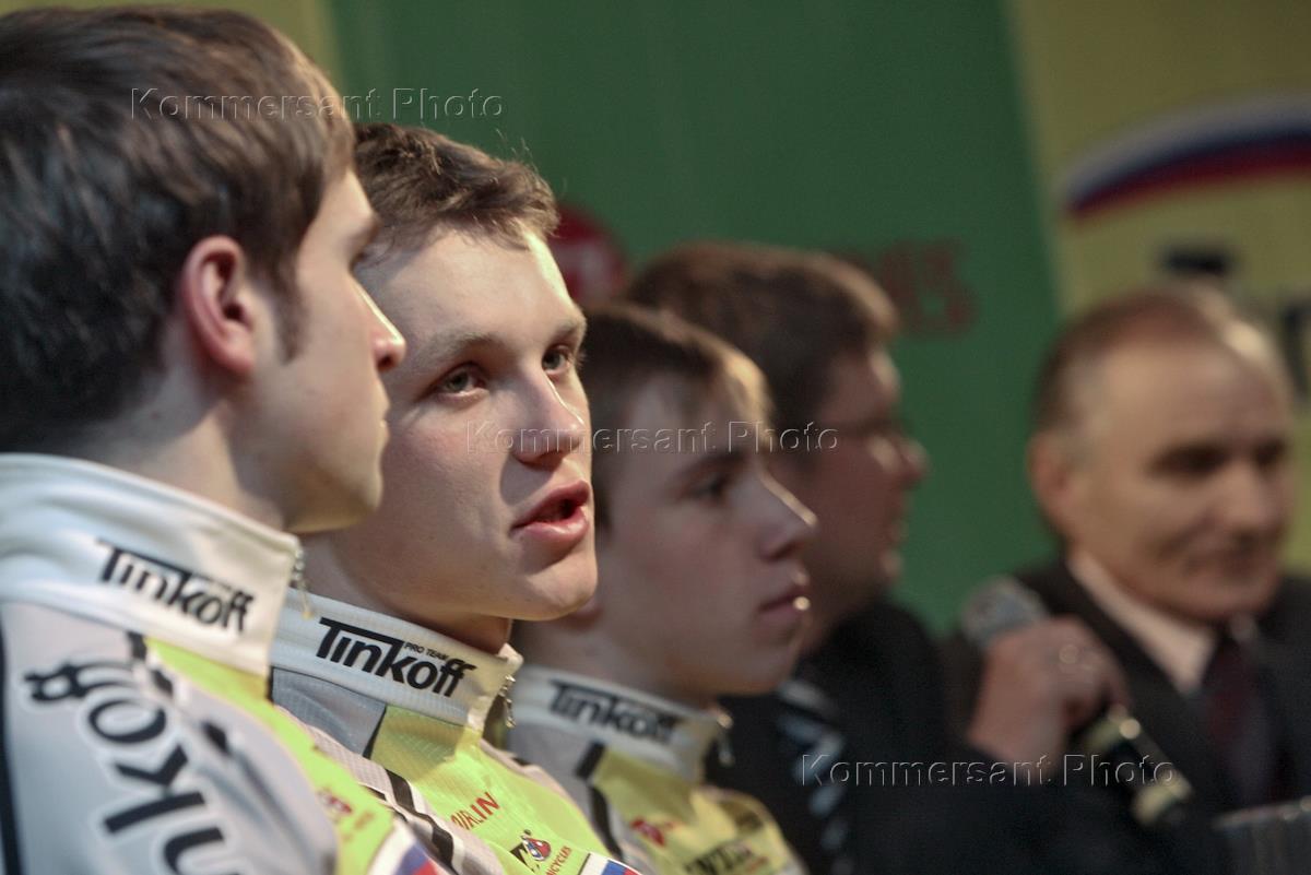Тренер по велоспорту Александр Кузнецов (второй справа) на презентации российской команды по велосипедному спорту "Тинькофф" в ресторане "Тинькофф".