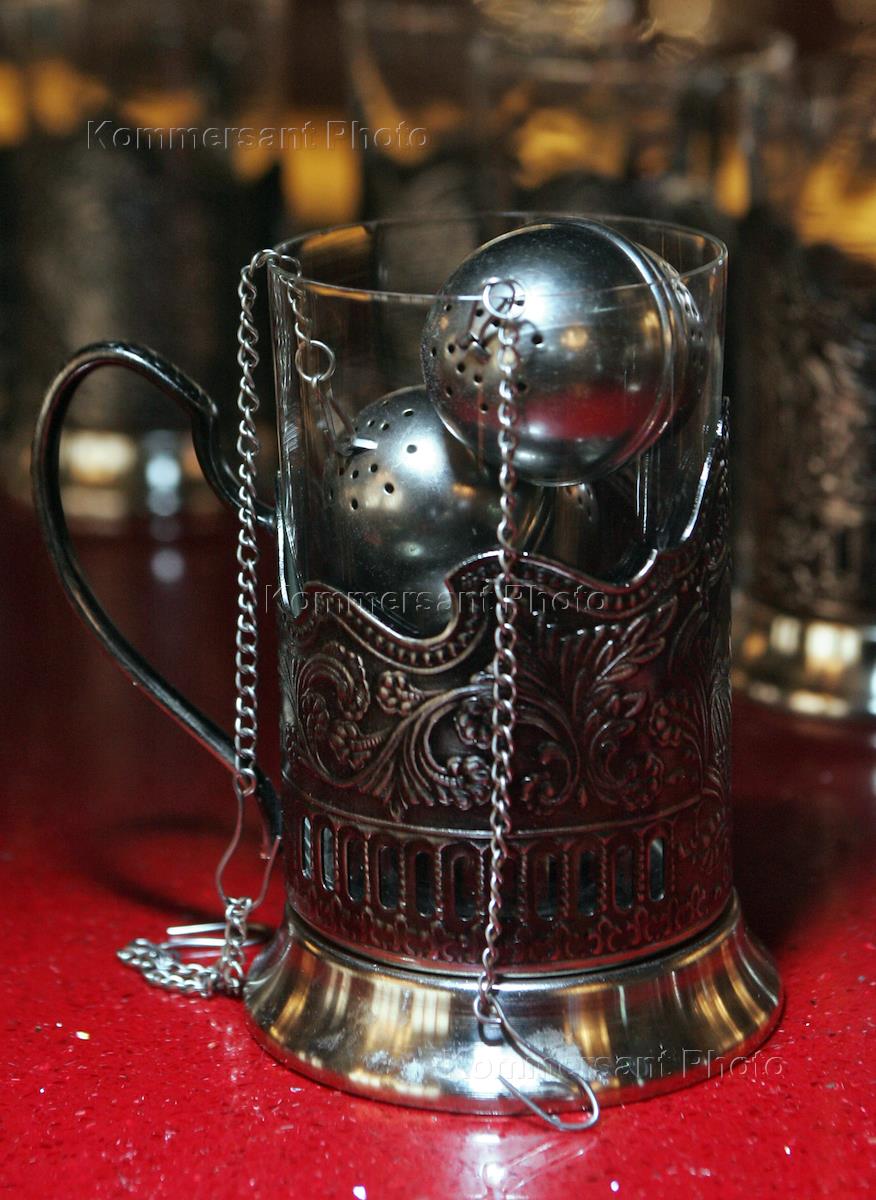 Ресторан "Водка-Бар" на улице Льва Толстого. Серебряный подстаканник и ситечки для чай.