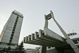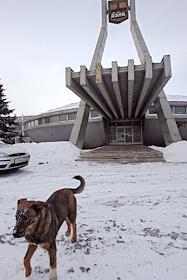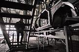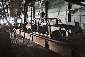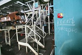 Неработающий конвейер по сборке автомобилей "Москвич" на заводе ОАО "Москвич". Надпись мелом на стене "не включать!".