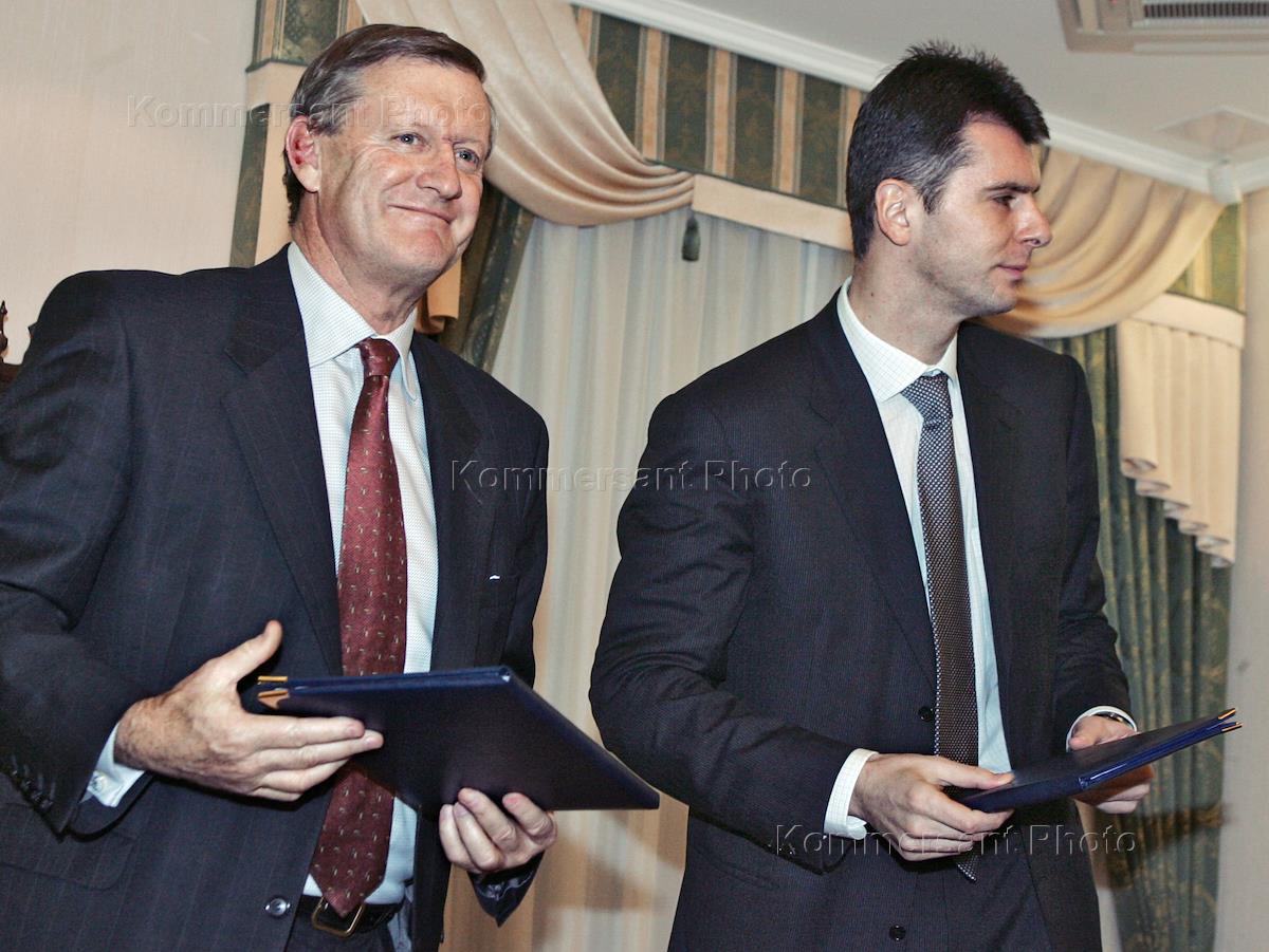 Генеральный директор компании "Rio Tinto" Ли Клиффорд (слева) и генеральный директор ОАО "ГМК "Норильский никель" Михаил Прохоров (справа) на церемонии подписания протокола о создании совместного предприятия между ОАО "ГМК Норильский никель" и "Rio Tinto". Церемония прошла в здании Министерства природных ресурсов России.