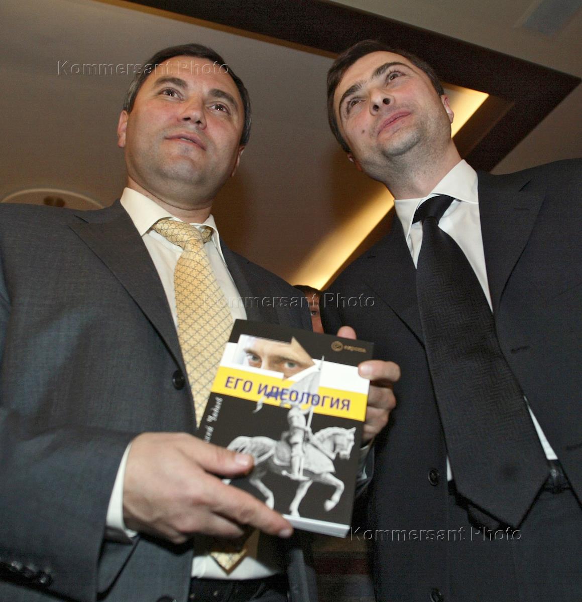 Заместитель руководителя администрации Президента России Владислав Сурков (слева) и секретарь президиума генерального совета партии "Единая Россия" Вячеслав Володин (справа) на презентации книги Алексея Чадаева "Путин. Его идеология". Презентация, организованная центральным исполнительным комитетом всероссийской политической партии "Единая Россия", прошла в ресторане "Da Cicco".