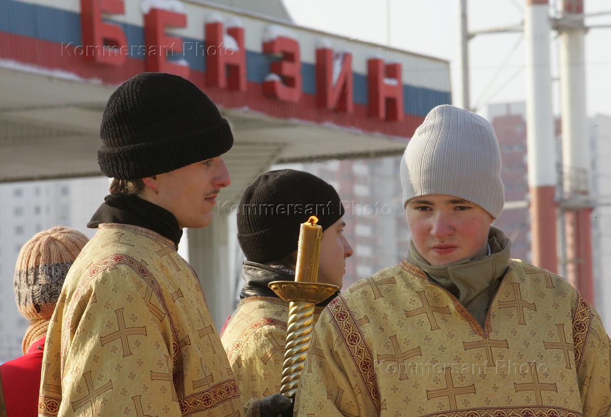 Годовщина трагедии в "Трансвааль-парке". Архиепископ Истринский Арсений, викарий Московской епархии (в центре) на месте обрушения "Трансвааль-парка" освятил закладной камень мемориального храма - часовни в честь всех святых.
