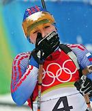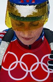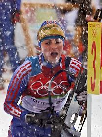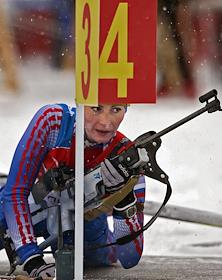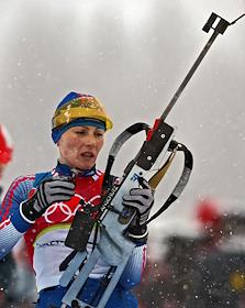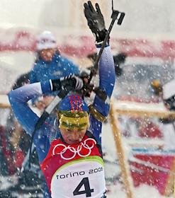 XX зимние Олимпийские игры 2006. Член олимпийской сборной России Альбина Ахатова во время соревнования по биатлону в гонке с преследованием. Ахатова завоевала бронзовую медаль.