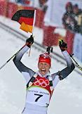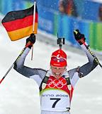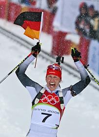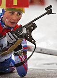 XX зимние Олимпийские игры 2006. Член олимпийской сборной Германии Кати Вильхельм во время соревнования по биатлону в гонке с преследованием. Вильхельм завоевала золотую медаль Олимпиады.