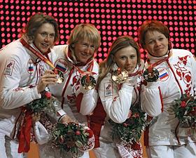 XX зимние Олимпийские игры 2006. Члены олимпийской сборной России по лыжам Наталья Баранова (слева), Лариса Куркина (вторая слева), Юлия Чепалова (в центре) и Евгения Медведева (справа) после церемонии награждения победителей в эстафетной гонке по лыжам 4 x 5 км. Российская команда выиграла золотые медали Олимпиады.