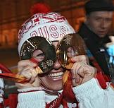 XX зимние Олимпийские игры 2006. Член олимпийской сборной России по лыжам Евгения Медведева после церемонии награждения победителей в эстафетной гонке по лыжам 4 x 5 км. Российская команда выиграла золотые медали Олимпиады.