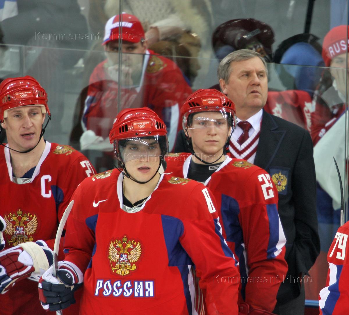 XX зимние Олимпийские игры 2006. Главный тренер российской сборной по хоккею Владимир Крикунов (справа) и игрок сборной России Александр Овечкин (второй слева) во время матча между сборными России и Чехии (0:3).