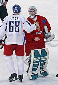 XX зимние Олимпийские игры 2006. Хоккейный матч между сборными России и Чехии (0:3). Яромир Ягр (слева) и Евгений Набоков (справа).