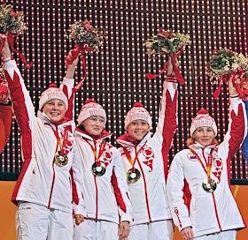 XX зимние Олимпийские игры 2006. Российские биатлонистки Анна Богалий (справа), Ольга Зайцева (вторая слева), Альбина Ахатова (слева) и Светлана Ишмуратова (вторая справа) в эстафете 4 по 6 километров завоевали золотые медали.