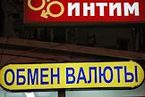 Вывеска обмена валюты на фоне здания Министерства иностранных дел России на Смоленской площади.