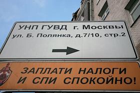 Дорожный указатель УНП ГУВД города Москвы и агитационный плакат налоговой службы "Заплати налоги и спи спокойно".