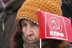Митинг Коммунистической партии России (КПРФ) против увеличения тарифов ЖКХ прошел на Калужской площади. Пожилая женщина с флажком КПРФ.