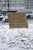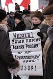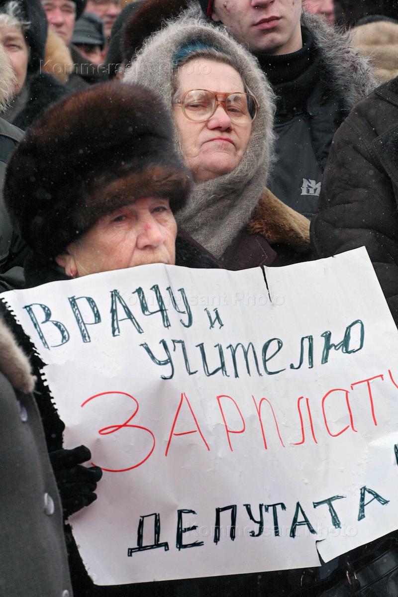 Митинг Коммунистической партии России (КПРФ) против увеличения тарифов ЖКХ прошел на Комсомольской площади. Плакат "Врачу и учителю зарплату депутата!".