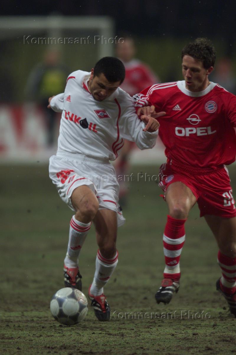 Игрок московского "Спартака" Джафар Ирисметов (слева) в борьбе за мяч. Второй матч между командами "Спартак" (Москва) и "Bayern" (Мюнхен), проходивший на стадионе "Лужники", завершился поражением московского "Спартака" со счетом 0 : 3.