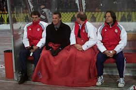 Тренер команды "Bayern" из Мюнхена Оттмар Хитцфельд (второй слева) наблюдает за игрой своей команды на стадионе "Лужники". Второй матч между командами "Спартак" (Москва) и "Bayern" (Мюнхен) завершился поражением московского "Спартака" со счетом 0 : 3.