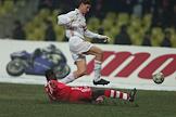 Футболист команды "Спартак" Луис Робсон (сидит) и игрок команды "Bayern" (Мюнхен) Томас Линке (лежит) упали в борьбе за мяч. Второй матч между командами "Спартак" (Москва) и "Bayern" (Мюнхен), проходивший на стадионе "Лужники", завершился поражением московского "Спартака" со счетом 0 : 3.